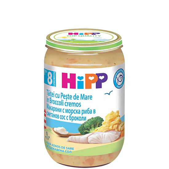 ХИП 6550 ПЮРЕ СПАГЕТИ,БРОКОЛИ,СМЕТАНОВ СОС И РИБА 220ГР - HiPP гарантира, че рибата е била уловена съгласно внимателно устойчива практика за запазване на рибните ресурси и срещу прекомерният улов на морска риба.