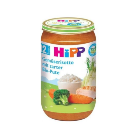 ХИП 6800 ПЮРЕ ЗЕЛЕНЧУКОВО РИЗОТО С ПУЕШКО БИО 250Г - Hipp Био зеленчуково ризото с пуешко месо е органично зеленчуково бебешко пюре предназначено за деца над 12 месеца, съдържащо малки парченца, които приучават детето да дъвче. Всички менюта HiPP съдържат висококачествено биологично рапично олио, което е естествен източник на Омега-3 мастни киселини - важни за здравословното развитие и растеж на мозъка и нервните клетки. Пюрето не съдържа добавени ароматизатори, сгъстители или захари. Пюрето е направено от 100% органични продукти.