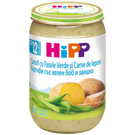 ХИП 6853 ПЮРЕ КАРТОФИ СЪС ЗЕЛЕН БОБ И ЗАЕШКО 220ГР - Менюто на Hipp с картофи, зелен боб и заешко месо е подходящо за деца от 12-месечна възраст. В неговите съставки се съдържат Омега-3 мастни киселини, които подпомагат развитието на мозъка и нервната тъкан. Пюрето съдържа и малки частици, които стимулират дъвченето. Продуктът няма добавени ароматизанти, консерванти и оцветители.