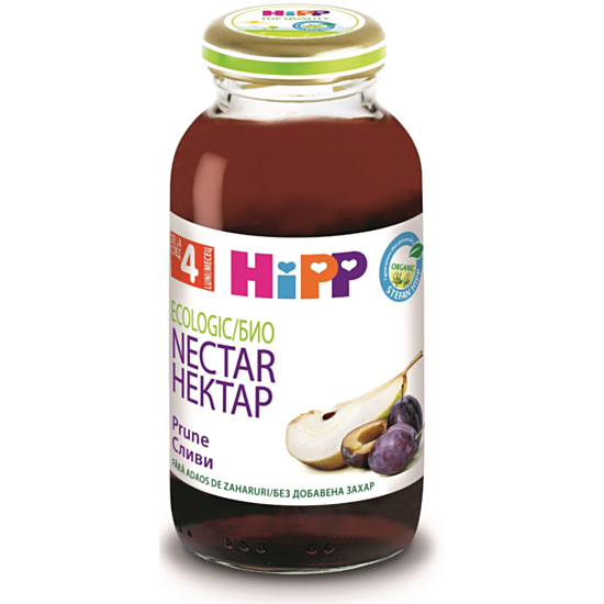 ХИП 8043 СОК СЛИВИ 200МЛ - Нектарът от Hipp е произведен от био плодове, узрели на слънце. Той е с ниска киселинност и е специално създаден така, че да не дразни нежното бебешко стомахче. Нектарът е добър източник на витамини и е без добавена захар. Не съдържа глутен, както и изкуствени аромати и оцветители.