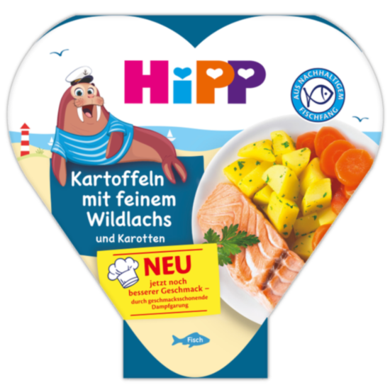 HiPP Био Картофи с фина сьомга и моркови е създадено специално за малките любители на рибата. Комбинацията от нежни картофи, моркови и висококачествена дива сьомга от устойчив риболов предлага пълноценна и разнообразна храна, която детето може да хапва самостоятелно. Пълноценно био ястие – съдържа важни хранителни вещества, подходящи за растящия организъм на детето. Риба от устойчив риболов – HiPP използва само сьомга от отговорно и екологично рибарство. Приготвено на пара– съставките се приготвят внимателно на пара, за да се запазят естественият вкус и ценните витамини. Готово за консумация – бързо и лесно се затопля, идеално за самостоятелно хранене в удобната купичка с форма на сърце. Без добавени аромати, оцветители и консерванти – само натурални био съставки.