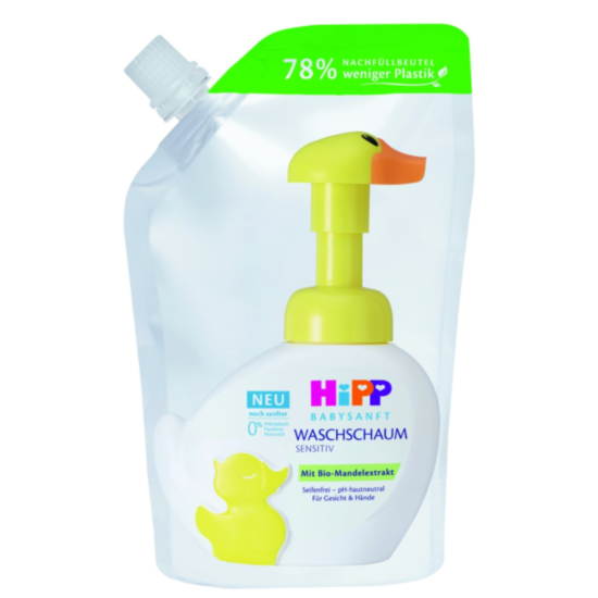 ХИП 90120 БЕБЕ ИЗМИВНА ПЯНА ПАТЕ ПЪЛНИТЕЛ 250МЛ е пълнител за Хип Бебесанфт Измивна пяна за ръце и лице Пате. Служи за презареждане на диспенсъра на оригиналния продукт. Опаковката на пълнителя може да се рециклира и съдържа 78% по-малко пластмаса, в сравнение със стандартната опаковка на измивната пяна. Има мека кремообразна пяна за нежно почистване на лицето и ръцете на най-малките. Почиства и същевременно хидратира и защитава нежната детска кожа от изсушаване. Има специална формула с неутрално pH, която не причинява дразнения на очите. Продуктът е обогатен и с екстракт от биологичен бадем, който се отличава с естествен подхранващ и защитаващ кожата ефект. Продуктът има деликатен хипоалергенен аромат. Не съдържа сапун. Не съдържа парабени, минерални масла, оцветители и PEG емулгатори. Не съдържа микро-пластмасови частици и водоразтворими, чисто синтетични полимери.