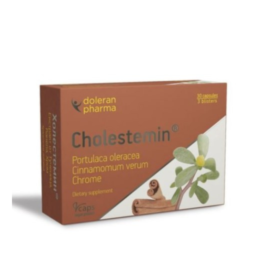 ХОЛЕСТЕМИН КАПС X 30 е специална хранителна добавка на Doleran Pharma, съдържаща екстракт от билката Тученица, която поддържа баланса на холестерола и триглицеридите, благоприятства за нормалните нива на кръвна захар и ефективното преработване на въглехидрати и мазнини. Хранителната добавка съдейства за нормалните функции на сърцето и сърдечно-съдоваситема система, на мозъка, нервната и храносмилателните системи, както и на зрението. Тученицата (Portulaca oleraceae) е богат източник на омега – 3 мастни киселини и е с високо съдържание на витамини и минерали. ОМЕГА – 3 мастните киселини, поддържат баланса на холестерола и триглицеридите. Те не могат да бъдат синтезирани в организма и често приемането им в препоръчителните количества е трудно. Хромът е микроелемент, необходим за нормалната концентрация на глюкоза в кръвта.