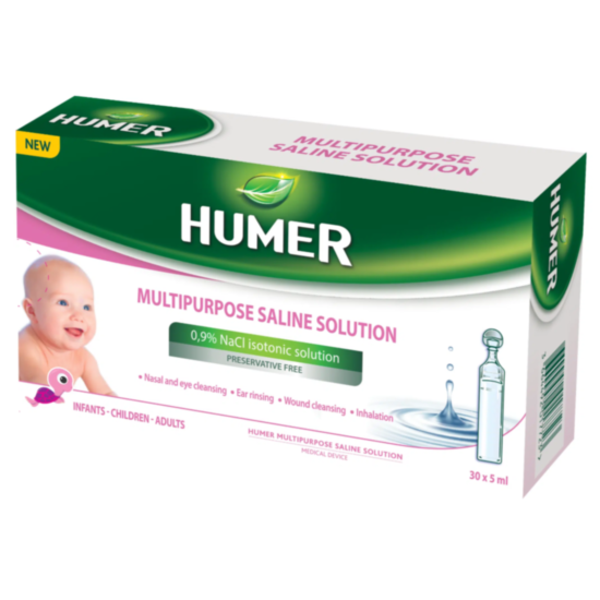 HUMER Мултифункционален физиологичен разтвор е стерилен изотоничен разтвор на 0,9% натриев хлорид в еднодозов флакон за почистване на носа и очите, промиване на ушите, промиване на рани и за инхалация. Не е за инжектиране.
