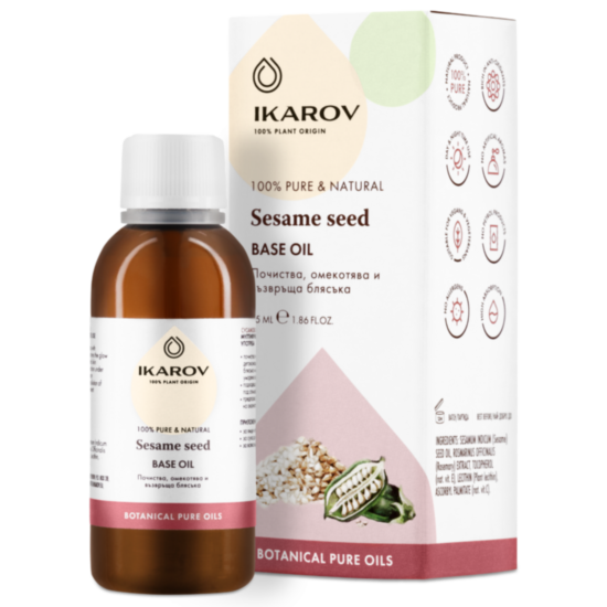 Сусамовото масло на Ikarov е богато на витамини Е и С, растителен лецитин и натурален екстракт от розмарин. Забавя стареенето на клетките и предпазва от замърсяванията на околната среда. Масажът с продукта почиства в дълбочина и детоксикира, като възвръща блясъка и мекотата на дехидратираната и уморена кожа. Подходящо е за суха, смесена и застаряваща кожа. Подходящо е за козметични маски на косата. Подходящ за дневна и нощна грижа. Без съставки или продукти от петролен произход. Без съставки или продукти от животински произход.