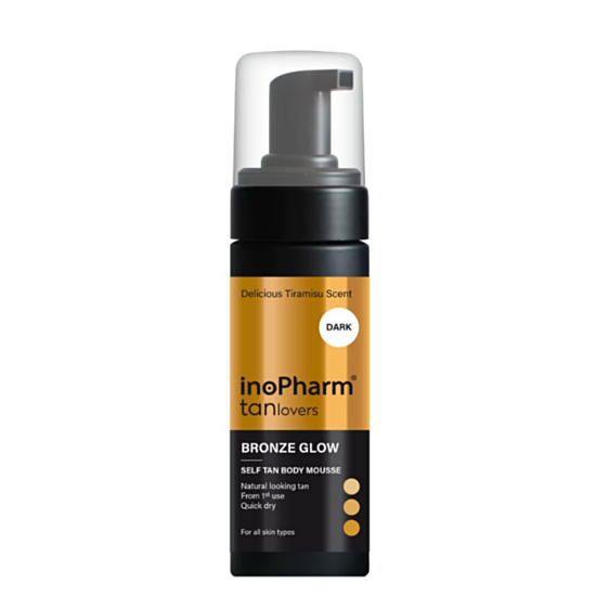 ИНОФАРМ АВТОБРОНЗАНТ ЗА ТЯЛО DARK 150МЛ е автобронзантен продукт за дълготраен бронзов загар на лицето и цялото тяло. Обогатен е с натурални и подхранващи съставки и опияняващ аромат тирамису. Осигурява равномерен и красив тен, без оранжеви следи.