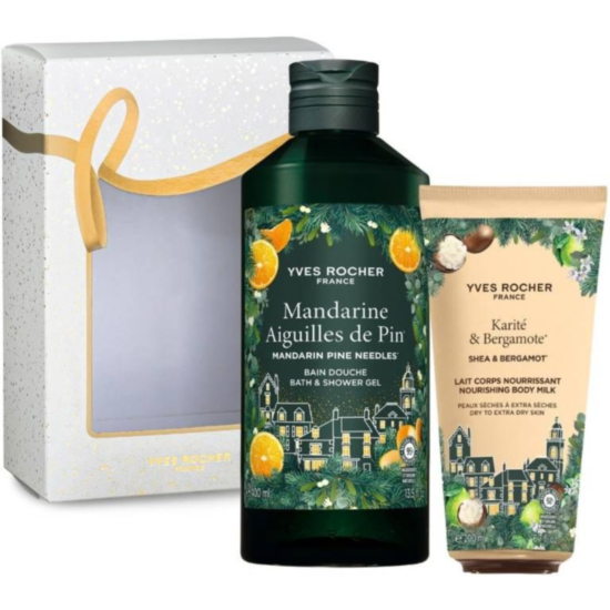 Комплектът на Yves Rocher включва 2 страхотни козметични продукта - душ гел Mandarine Aiguilles de Pin и мляко за тяло Karité & Bergamote. Душ гелът превръща ежедневното почистване в истински освежаващ ароматен ритуал. Неговата нежна, кремообразна пяна грижовно почиства кожата, без да нарушава естествения ѝ баланс. Формулата му е базирана на съставки от растителен произход и е без сулфати, като запазва естествената хидратация на кожата и я оставя копринено мека и приятно ухаеща. Млякото за тяло може да се нанася ежедневно върху цялото тяло, като се абсорбира бързо. Обгръщащата му текстура съчетава подхранващите и възстановяващи ползи от маслото от ший с успокояващите и деликатни нотки на бергамот.