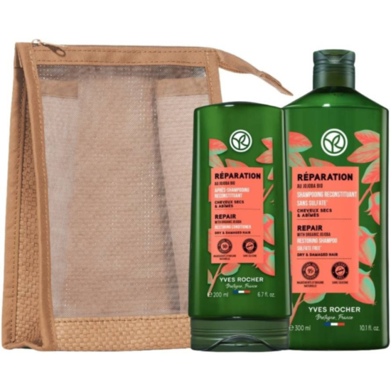 Комплектът Reparation на Yves Rocher включва 2 козметични продукта, които ще се погрижат за косата, като я подхранят и възстановят - шампоан и балсам.