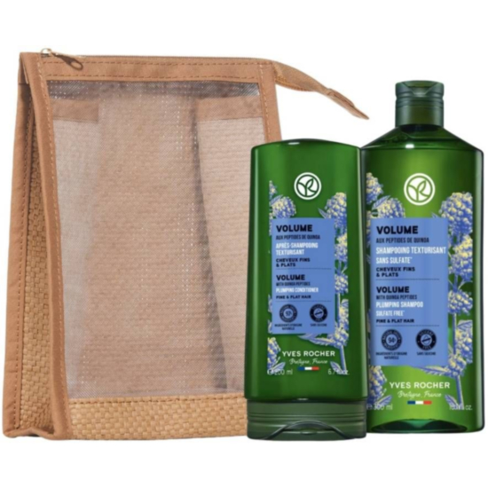Комплектът Volume на Yves Rocher включва 2 страхотни продукта, които предлагат цялостна грижа за косата и осигуряват пищен и красив обем - шампоан и балсам. Те съдържат пептиди от киноа, които се прикрепят към кутикулите на косъма и така увеличават обема им, без да ги утежняват.