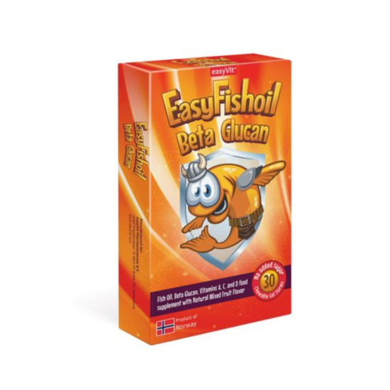 EasyFishoil Beta Glucan е хранителна добавка, която комбинира бета глюкан, витамини A, C и D с високоусвоими Омега-3 мастни киселини. Подходящ е както за есенно-зимния сезон, така и за възстановяване след продължително боледуване. Формулата съдържа Омега-3 в висока концентрация, а оптималното количество ненаситени мастни киселини в мека капсула отговаря на препоръчителния дневен прием. Витамините A, C и D подпомагат нормалната функция на имунната система.