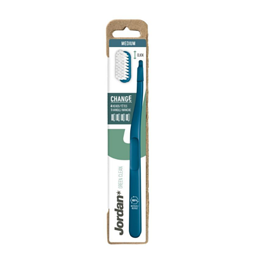 JORDAN ЧЕТКА ЗА ЗЪБИ КЛИЙН МЕДИУМ С 4 БРОЯ СМЕНЯЩИ СЕ ГЛАВИ е четка за зъби със сменяема глава. Влакната на четката не дразнят, почистват нежно, масажират и облекчават дискомфорта. Тя е изработена от рециклирана пластмаса с 4 сменяеми глави, направени с найлонови влакна на био основа. Специално профилираната дръжка, покрита с неплъзгащ се материал, ляга удобно в ръката и позволява цялостно почистване.