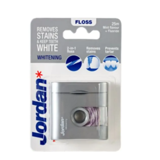 JORDAN КОНЕЦ ЗА ЗЪБИ ИЗБЕЛВАЩ 25М е висококачествен продукт за поддържане на орална хигиена. Конецът за зъби има ментов вкус и се отличава с висока функционалност. С негова помощ ефективно се почистват междузъбните пространства. Благодарение на съдържанието си на флуор предпазва зъбите от кариеси. Осигурява още избелващ ефект.