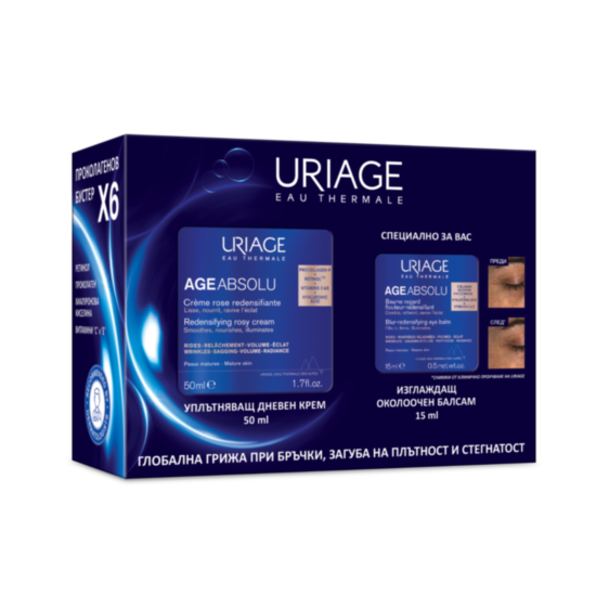 Uriage Age Absolu е концентриран дневен крем против стареене за зряла кожа, който има уплътняващ ефект. Действа срещу признаците на стареене, като отпускане, бръчки, загуба на обем и липса на блясък. Съдържа комплекс от активни съставки проколагенов пептид, ретинол, витамини C и E, хиалуронова киселина, липидо-възстановяващ растителен комплекс (масла от карите, илипе и жожоба). Стяга и уплътнява лицевия контур. Кожата е тонизирана и с естествен свеж блясък, изглеждайки по-млада. Подходящ за всеки тип кожа, дори най-чувствителната. С 91% съставки от натурален произход.