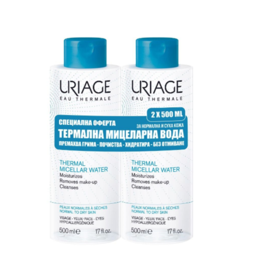 ЮРИАЖ КОМПЛЕКТ ТЕРМАЛНА МИЦЕЛАРНА ВОДА ЗА НОРМАЛНА И СУХА КОЖА 2 Х 500МЛ е мицеларна вода за нормална и суха кожа, която почиства кожата и отстранява всякакви замърсявания и грим, благодарение на уникалните свойства на Термалната вода Uriage и нежните нейонни повърхностно активни вещества. Мицеларната технология им позволява да действат като магнит за ефективно улавяне на грима и замърсяванията, за перфектно почистена кожа и максимален комфорт през целия ден. Подходящ за лице и околоочен контур. Юриаж Термална Мицеларна вода за нормална към суха кожа е обогатена с екстракт от червена боровинка, който има антиоксидантно действие, хидратира кожата, дарявайки я с мекота и еластичност. Без парабени. Хипоалергенен. Офталмологично и дерматологично тестван продукт.