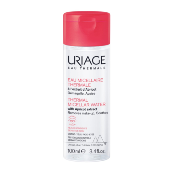 ЮРИАЖ ТЕРМАЛНА МИЦЕЛАРНА ВОДА ЧУВСТВИТЕЛНА КОЖА 100МЛ е мицеларна вода, подходяща за чувствителна кожа, склонна към зачервявания. Юриаж Термална Мицеларна вода за чувствителна кожа почиства и отстранява всякакви замърсявания и грим, благодарение на уникалните свойства на Термалната вода Uriage и нежните нейонни повърхностно активни вещества. Мицеларната технология им позволява да действат като магнит за ефективно улавяне на грима и замърсяванията, за перфектно почистена кожа и максимален комфорт през целия ден. Формулата е обогатена с екстракт от кайсия, която успокоява кожата дълготрайно и предпазва от изсушаване. Без парабени. Хипоалергенен. Офталмологично и дерматологично тестван продукт.
