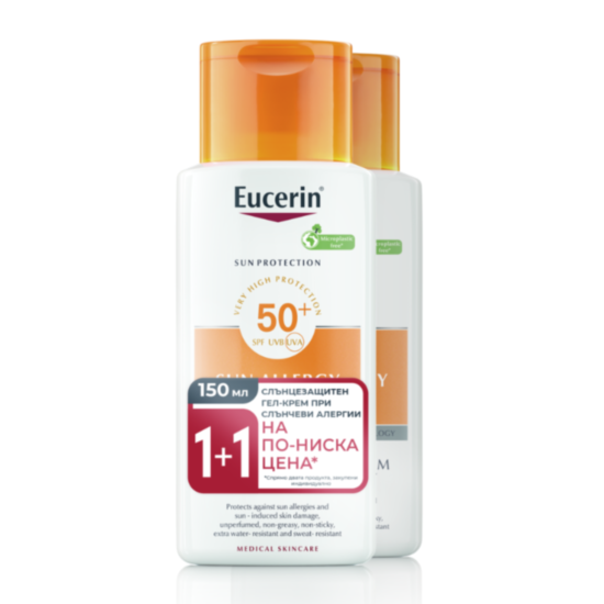 Eucerin® Слънцезащитен крем-гел, подходящ при склонност към слънчеви алергии SPF 50+, DUO Pack 1+1