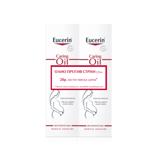 Eucerin Олио против стрии е разработено специално за нуждите на чувствителната кожа, дори по време на бременност. То съдържа витамин Е и висококачествени чисти растителни масла, богати на линолеева киселина, ненаситена мастна киселина, която подсилва естествената бариерна функция на кожата.