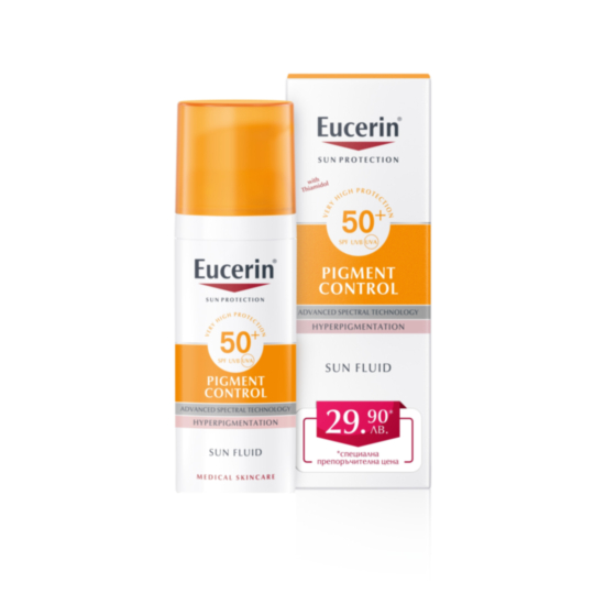 Eucerin слънцезащитен флуид Pigment Control SPF 50+ има приятна лека текстура, която попива бързо и има добра поносимост, доказана в клинични и дерматологични проучвания, дори при чувствителна кожа.