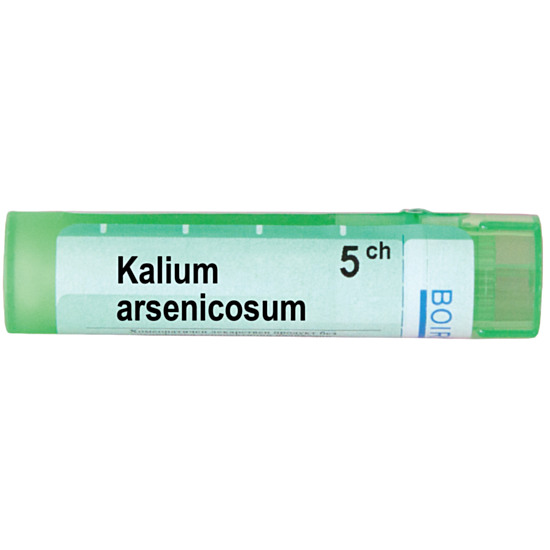 Монопрепарат без специфични терапевтични показания. Назначава се от хомеопат. Хомеопатичните монопрепарати се приемат през устата. Не е желателно да се яде и пие нищо 15 минути преди и половин час след прием. Гранулите се поставят под езика до пълното им разтваряне. При бебета и малки деца гранулите могат да се разтворят в малко вода и да се дават с малка лъжичка. По време на лечението е желателно да се избягва консумацията на цигари, кафе, чай от мента и други билки, съдържащи етерични масла поне 2 часа преди и след приема. Оплакванията от екзема или сърбеж могат да бъдат смекчени с 3 гранули Kalium arsenicosum 5 CH по 3 пъти на ден.