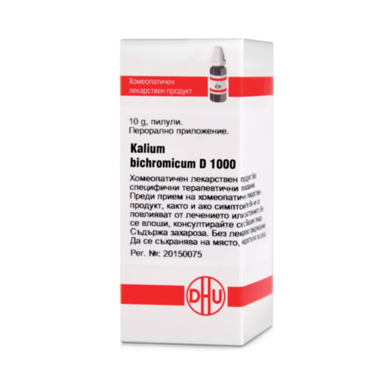 DHU Kalium Bichromicum D1000 представлява хомеопатичен лекарствен продукт, получен от калиев бихромат. Калиум бихромикум е монопрепарат за приложение при наличие на възпалителни процеси. Оказва благоприятен ефект при синузит и конюнктивит. Препоръчва се за прием при проблеми със стомашно-чревния тракт. Облекчава възпаления на дихателните пътища. Може да се приема и като средство за подпомагане нормалната функция на двигателния апарат. Хомеопатичните лекарства представляват силно разредени субстанции на неорганични соли, минерали, растения, тъкани, отрови и др., които носят в себе си специфичното действие, характерно за веществото, от което са получени. Най-общо казано, действието на хомеопатичното лекарство се състои в подаването на сигнал към организма, който да мобилизира самооздравителните си сили на всички нива: умствено, емоционално и физическо.