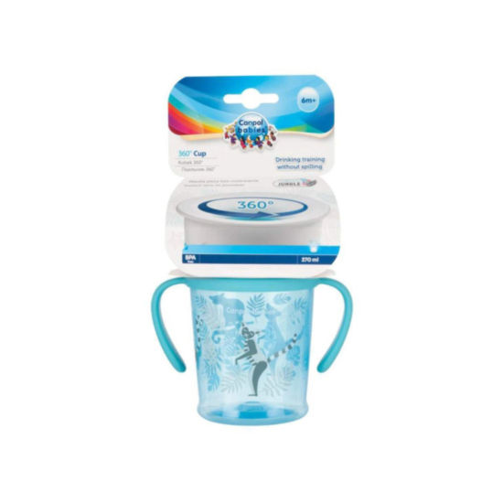 Преходна чаша с дръжки 360° е предназначена за деца над 6 месеца, с нея Вашето дете лесно ще привикне към пиенето от чаша. Тя е специално разработена за развитие на уменията за пиене от чаша, защото няма нито сламка, нито накрайник, но е снабдена с клапа, която предпазва от разливане. Големите ергономични дръжки са удобни за хващане, защото са леко извити и гумирани, което предотвратява изплъзване от ръцете. Canpol babies Преходна чаша с дръжки 360° има меки ръбове и детето може да отпива от всички страни като голям човек. Капачето предпазва чашата от замърсяване когато не се използва. Тя е изработена от материали без съдържание на Бисфенол А, лесна за разглобяване и почистване, подходяща е и за съдомиялна машина.