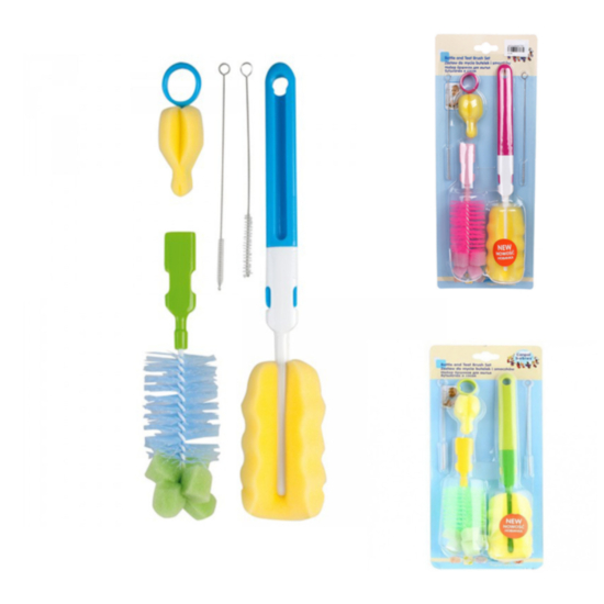 Практичният комплект четки улеснява ежедневното почистване на шишета и биберони.Малката четка с гъба е предназначена за нежно почистване на биберони от мляко или каша. За почистване на шишетата се използват двете по-големи четки.Комплектът разполага и с две допълнителни четки, които са идеални за почистване на сламки и други накрайници. Благодарение на сменяемата дръжка, те могат да се използват взаимозаменяемо в зависимост от вашите нужди.Влакната на четките са изработени от материал, който не надрасква повърхността.Гъбата позволява прецизно измиване на дъното на шишетата. Комплектът се предлага в няколко различни цвята.