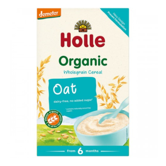 КАША ОВЕСЕНА 250ГР HOLLE ДЕМЕТЕР e висококачествена безмлечна каша с овес, създадена специално за храненето на бебета над 6-месечна възраст. Овесът е богат на витамините А, В1, В2, В6, С, Е, К, както и на минералите силиций, калций, желязо, калий и фосфор и аминокиселини. Холе Био бебешка безмлечна каша с овес 6М+ се приготвя бързо и лесно, без допълнително варене и е лесно смилаема. Доставя на организма на бебето необходимите за растежа и развитието му на този етап вещества във вкусна и засищаща форма. Може да се използва както в сладки, така и в солени рецепти, в зависимост от вашите предпочитания. Не съдържа аромати, осветители и консерванти. Без лактоза.