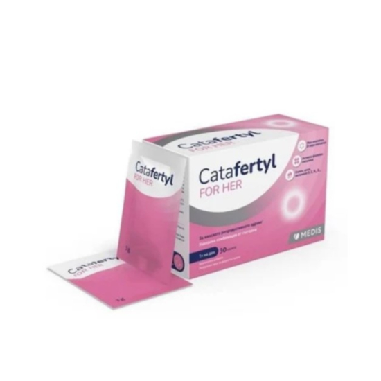 КАТАФЕРТИЛ ЗА НЕЯ САШЕТИ Х 30 - комбинира 9 съставки, които благоприятстват хормоналния баланс и плодовитостта при жените. Той е подходящ при синдром на поликистозните яйчници, проблеми с плодовитостта и нередовен менструален цикъл. Съдържа Мио инозитол, D хиро инозитол, активна фолиева киселина, селен, цинк, витамини Е, D3, В6, В12. Инозитолите насърчават женската плодовитост и поддържат физиологичната бременност. Съотношението 40:1 на мио-инозитол/хиро-инозитол, подобрява инсулиновата чувствителност в черния дроб и мускулите чрез D хиро инозитол с последващо намаляване на циркулиращия инсулин, възстановява нивата на мио инозитол в яйчника, което води до по добро качество на яйцеклетките. С вкус на портокал и мандарина. Без лактоза, глутен и ГМО.