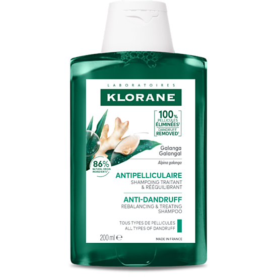 Klorane Ребалансиращ и третиращ шампоан с галанга използва пълната сила на този естествен лечебен корен, част от семейството на куркумата, известен със своите успокояващи свойства против пърхот. Нежната му формула с естествен произход почиства косата, премахва всички видове пърхот и възстановява баланса на скалпа. Още с първото нанасяне шампоанът против пърхот с галанга почиства до 100%* от сухия и мазния пърхот, с ефикасност срещу повторна поява в продължение на 6 седмици след прекратяване на употребата. Пречистен и успокоен, скалпът е облекчен, а косата е лека, освежена и без пърхот, обгърната от нов аромат на кехлибар. Подходящ за честа употреба.