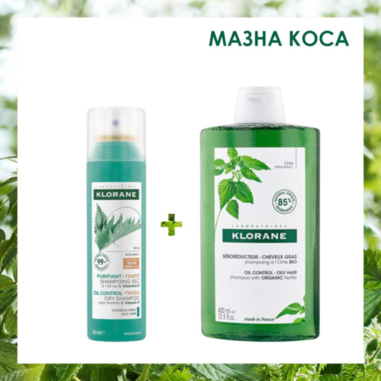 КЛОРАН РУТИНА ЗА МАЗНА КОСА С КОПРИВА ШАМПОАН 400МЛ + СУХ ШАМПОАН ОЦВЕТЕН 150МЛ / 43470 + 98521/