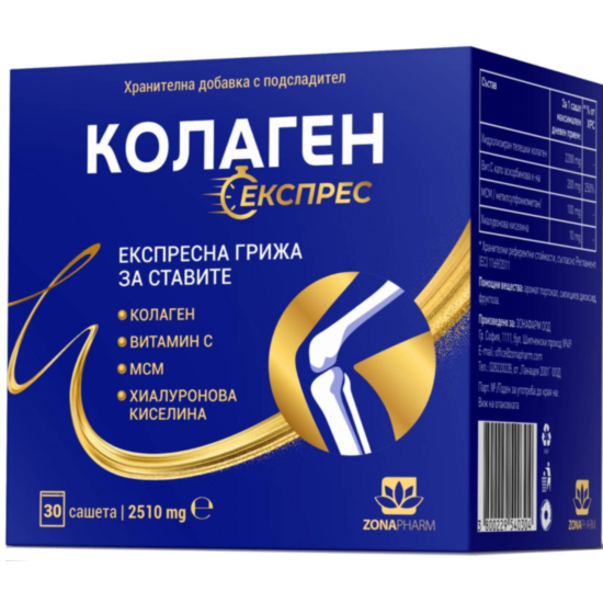 КОЛАГЕН ЕКСПРЕС САШЕТА Х 30 ЗОНАФАРМ - Колаген Експрес на Zona Pharma подхранва костите и ставите в дълбочина, като подобрява комфорта им и подкрепя здравината и еластичността на ставния хрущял.