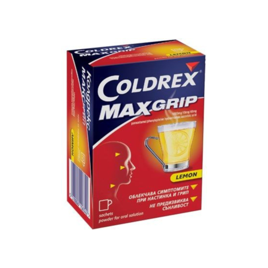 КОЛДРЕКС МАКС ГРИП Х 5 е лекарство без лекарско предписание, с аромат на лимон, съдържащо 1000мг от активното вещество парацетамол. Бързо и ефективно лекарство срещу симптомите на настинка и грип. Максимална сила в една доза - осигурява краткотрайно облекчаване на симптомите на настинката и грипа, включително главоболие, висока температура, възпалено гърло, мускулни и ставни болки, запушен нос, синузит и свързаната с него болка.
