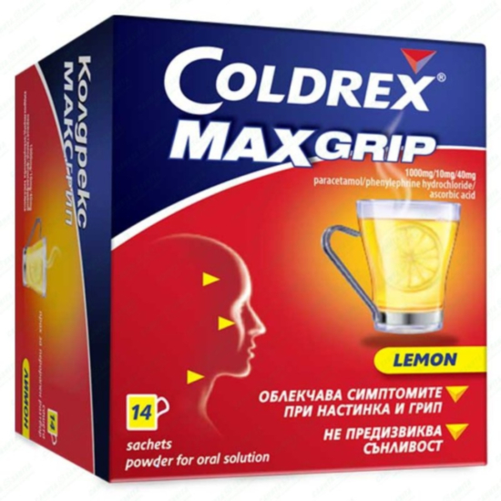 Колдрекс Максгрип е лекарствен продукт за облекчаване на симптомите при настинка и грип при възрастни. С вкус на лимон и под формата на сашета за лесна употреба и бърз ефект. Съдържа три активни съставки: парацетамол - облекчава болката и понижава високата температура, фенилефринов хидрохлорид, деконгестант за отпушване на носа и синусите, възобновява нормалното дишане, витамин С (аскорбинова киселина) - прилага се при грип и настинки поради повишените нужди на организма, особено в началния стадий на заболяването. Coldrex Max Grip не предизвиква сънливост. Предлага се в опаковка от 14 сашета.