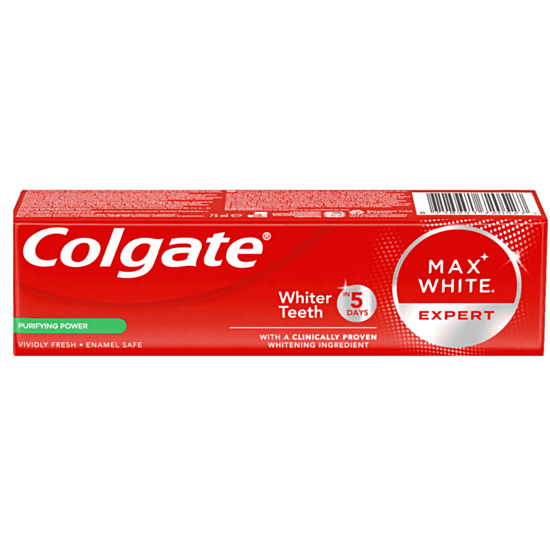 Опитайте пастата за зъби Colgate Max White Expert Purifying Power за по-бели зъби само за 5 дни! Пастата за зъби с водороден пероксид и мицеларна почистваща технология премахва замърсяванията и има свеж вкус!