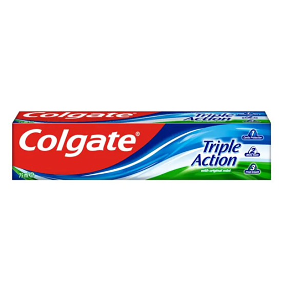 КОЛГЕЙТ ПАСТА ЗА ЗЪБИ ТРИПЪЛ ЕКШЪН 75МЛ е паста за зъби с тройно действие. Тя предоставя защита от кариес, бели зъби и свеж дъх. Подходяща е за цялото семейство. Също така предпазва зъбите от бактерии, отстранява петната по повърхността и освежава дъха.