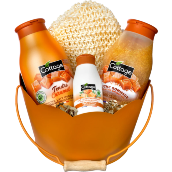 КОТАЖ КОМПЛЕКТ КАРАМЕЛ ДУШ ГЕЛ 250МЛ+СКРАБ ЗА ТЯЛО 250МЛ+ЛОСИОН ЗА ТЯЛО 50МЛ+РЪКАВИЦА ЗА БАНЯ