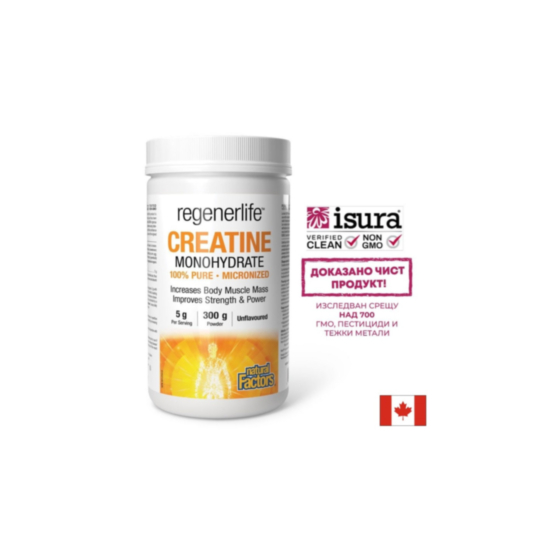 Creatine monohydrate от серията RеgenerLife на канадската компания Natural Factors e натурален продукт допринасящ за оптималното състояние на мускулите и енергийния метаболизъм.