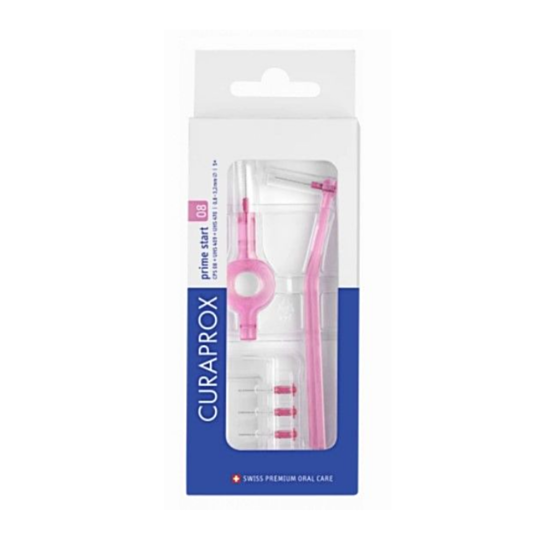 КУРАПРОКС ИТЕРДЕНТАЛНИ ЧЕТКИ PRIME START 08 (5БР+ПРАВ И КРЪГЪЛ ДЪРЖАЧ) А са 5 броя интердентални четки и два удобни държача (прав и кръгъл), на които може да се поставят. Нова клик система за удобно и хигиенично изваждане на допълнителните глави към основните държачи. Размерът на интерденталните четки е 008 (0,8 - 3,2 mm). Те ефективно почистват цялото интердентално пространство. При създаването им е използван материалът CURAL®, който представлява много тънка и здрава хирургична тел. Почистването на междузъбните зони спомага за намаляване на риска от образуване на плака и кариеси.