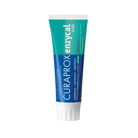 Kурапрокс паста за зъби Enzycal 1450 против кариес 75мл е висококачествена паста за зъби, която подпомага естествената защитна система на устната кухина. Ензимите, заедно с активните флуориди, спомагат за защита на повърхносста на вашите зъби срещу кариес.