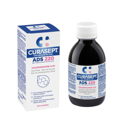 Curasept ADS DNA 220 вода за уста с хлорхексидин 0.20% за интензивна грижа при чувствителни венци, често кървене, подуване и възпаления в устната кухина. Препоръчва се след хирургични дентални процедури, поставяне на импланти, екстракции, както и при носене на протези и ортодонтски апарати. Образува защитен филм, овлажнява и облекчава раздразнението, без да причинява парене (без алкохол). Системата ADS не позволява оцветяване на зъбите и промяна във вкуса. Силна хидратация и локално антисептично действие.