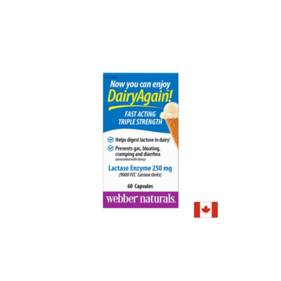 Лактаза ензим предлага бързо, превантивно облекчаване на типични симптоми на непоносимост към лактоза и съдейства за подобряване на храносмилането на храни, съдържащи лактоза (мляко и други млечни продукти). Продуктът на Webber Naturals съдържа 9000 единици FCC киселинна лактаза във всяка капсула.