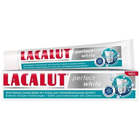ЛАКАЛУТ ПАСТА ЗА ЗЪБИ ПЪРФЕКТ УАЙТ 75МЛ е избелваща паста за зъби с мицеларна технология за дълбоко почистване. Ефективно премахва оцветяването причинено от кафе, чай, никотин и други храни като поддържа естествената белота на зъбите. Натривият флуорид и хидроксиапатитът подпомагат реминерализацията на зъбния емайл и по този начин го укрепват. Флуоридът предпазва зъбите от кариеси и защитава венците. Иновативната мицелна технология отстранява ефективно зъбната плака, като я улавя и спомага за по-лесното й отстраняване. Клинично тествана.
