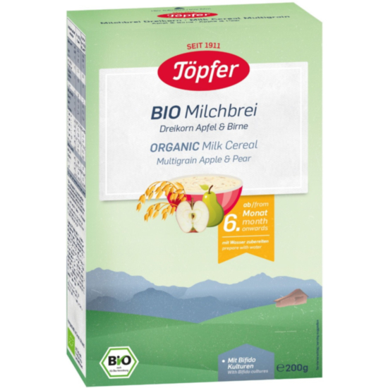 ЛАКТАНА БИО МЛЕЧНА КАША ПЪЛНОЗ.3вида ЗЪРНА,ЯБЪЛКА И КРУША 200г./ - засищащата био млечна каша Тьопфер Био Органик е подходяща за кърмачета и малки деца от началото на 6-тия месец. Прилага се само като част от разнообразен хранителен режим. Направена от биологично мляко и биологични пълнозърнести култури – овес, ечемик и спелта. Лекият плодов вкус се придава от съдържащите се биологични парченца круши и ябулки на прах, а запазването на ценните и важни хранителни вещества се осигурява благодарение на подбраните цели зърна от овес, ечемик и спелта. С включени в състава 4 вида бифидобактерии. Като основа за кашата е използвано преходно мляко. Кашата съдържа захари единствено от естествени източници. С глутен.