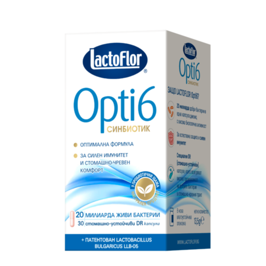 Синбиотикът Opti 6 от Lactoflor е подходящ по време и след антибиотично действие с цел бързо повишаване на имунитета. Приемът на антибиотици нарушава здравословния баланс на чревния микрибиом и затова е нужно организмът да се защити.