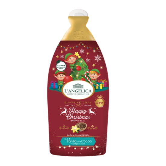 Душ гел Happy Christmas Ванилия и какао на L'ANGELICA е изключително предложение за всеки, който цени нежната грижа и изисканите аромати. Този ароматен продукт съчетава сладките нотки на какао с деликатната мекота на ванилията, създавайки усещане за уют и топлина. Формулата му е създадена така, че да почиства кожата внимателно, без да я изсушава, като същевременно я обгръща с кадифена пяна. Не съдържа агресивни съставки, което го прави подходящ и за чувствителна кожа. Подарете си моменти на истинско удоволствие под душа с този нежен измиващ продукт и се потопете в магията на коледните аромати. Дерматологично потвърдена съвместимост с кожата.