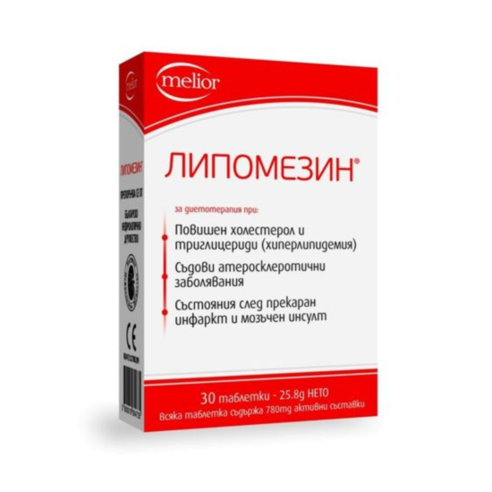 Melior Липомезин специална хранителна добавка, съдържаща оптимално балансирана комбинация от сухи екстракти на мая от червен ориз, леспедеза капитата и гроздово семе, която благоприятства състояния на прекаран инфаркт и мозъчен инсулт, както и съдови атеросклерозни заболявания, спомага за балансиране на нивата на добрия и лошия холестерол и триглицеридите в кръвта. Благодарение на активните си съставки, Melior Липомезин допринася за ограничаване на образуването на атеросклеротичните плаки и процесите на тромбозиране в съдовете, подобрява коронарното и мозъчното кръвообращение и по този начин спомага за намаляване на острите и хронични исхемични съдови увреди на сърцето и мозъка.