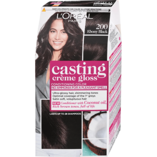 ЛОРЕАЛ БОЯ ЗА КОСА КАСТИНГ КРЕМ ГЛОС 200 - Боята за коса L’Oreal Casting Crème Gloss е без амоняк, което я прави изключително щадяща към косата. Издържа до 28 измивания с шампоан и оптимално покрива първите бели коси. Придава на косата неповторим блясък, сияен цвят и жизненост. Предлага се с меден балсам, който подхранва в дълбочина и има силно омекотяващо действие.