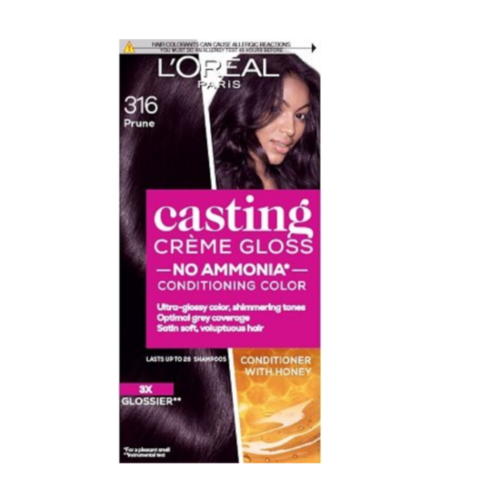 ЛОРЕАЛ БОЯ ЗА КОСА КАСТИНГ КРЕМ ГЛОС 316 е висококачествена боя за коса без амоняк. Продуктът връща естествения блясък на косата, като тя става 4 пъти по-блестяща. Резултатът от боядисването е естествен и дълготраен. Боята е добър избор при боядисване за първи път, при първите бели коси, при желание да смените цвета на косата. Продуктът обагря косата в преливащи нюанси. В същото време възстановява и освежава изцяло цвета. Съдържа и подхранващ комплекс, който защитава косъма за дълго време. Формулата е обогатена с пчелно млечице за мека и копринена коса. Боята е с приятен аромат. След боядисването подхранващият балсам с пчелно млечице подхранва косъма и обновява блясъка на цвета до следващото боядисване.