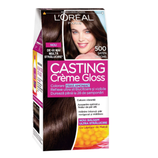 ЛОРЕАЛ БОЯ ЗА КОСА КАСТИНГ КРЕМ ГЛОС 500 е висококачествена боя за коса без амоняк. Лореал Кастинг Крем Глос Боя за коса без амоняк 500 Средно Кестеняво перфектно покрива белите коси и другите цветове. Продуктът връща естествения блясък на косата, като тя става 4 пъти по-блестяща. Резултатът от боядисването е естествен и дълготраен. Боята е добър избор при боядисване за първи път, при първите бели коси, при желание да смените цвета на косата. Продуктът обагря косата в преливащи нюанси. В същото време възстановява и освежава изцяло цвета. Съдържа и подхранващ комплекс, който защитава косъма за дълго време. Формулата е обогатена с пчелно млечице за мека и копринена коса. Боята е с приятен аромат. След боядисването подхранващият балсам с пчелно млечице подхранва косъма и обновява блясъка на цвета до следващото боядисване. За всеки тип коса.