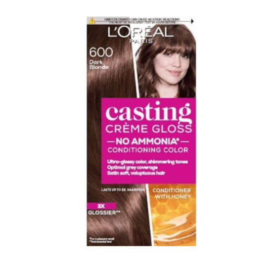 ЛОРЕАЛ БОЯ ЗА КОСА КАСТИНГ КРЕМ ГЛОС 600 е висококачествена боя за коса без амоняк. Продуктът връща естествения блясък на косата, като тя става 4 пъти по-блестяща. Резултатът от боядисването е естествен и дълготраен. Боята е добър избор при боядисване за първи път, при първите бели коси, при желание да смените цвета на косата. Продуктът обагря косата в преливащи нюанси. В същото време възстановява и освежава изцяло цвета. Съдържа и подхранващ комплекс, който защитава косъма за дълго време. Формулата е обогатена с пчелно млечице за мека и копринена коса. Боята е с приятен аромат. След боядисването подхранващият балсам с пчелно млечице подхранва косъма и обновява блясъка на цвета до следващото боядисване.